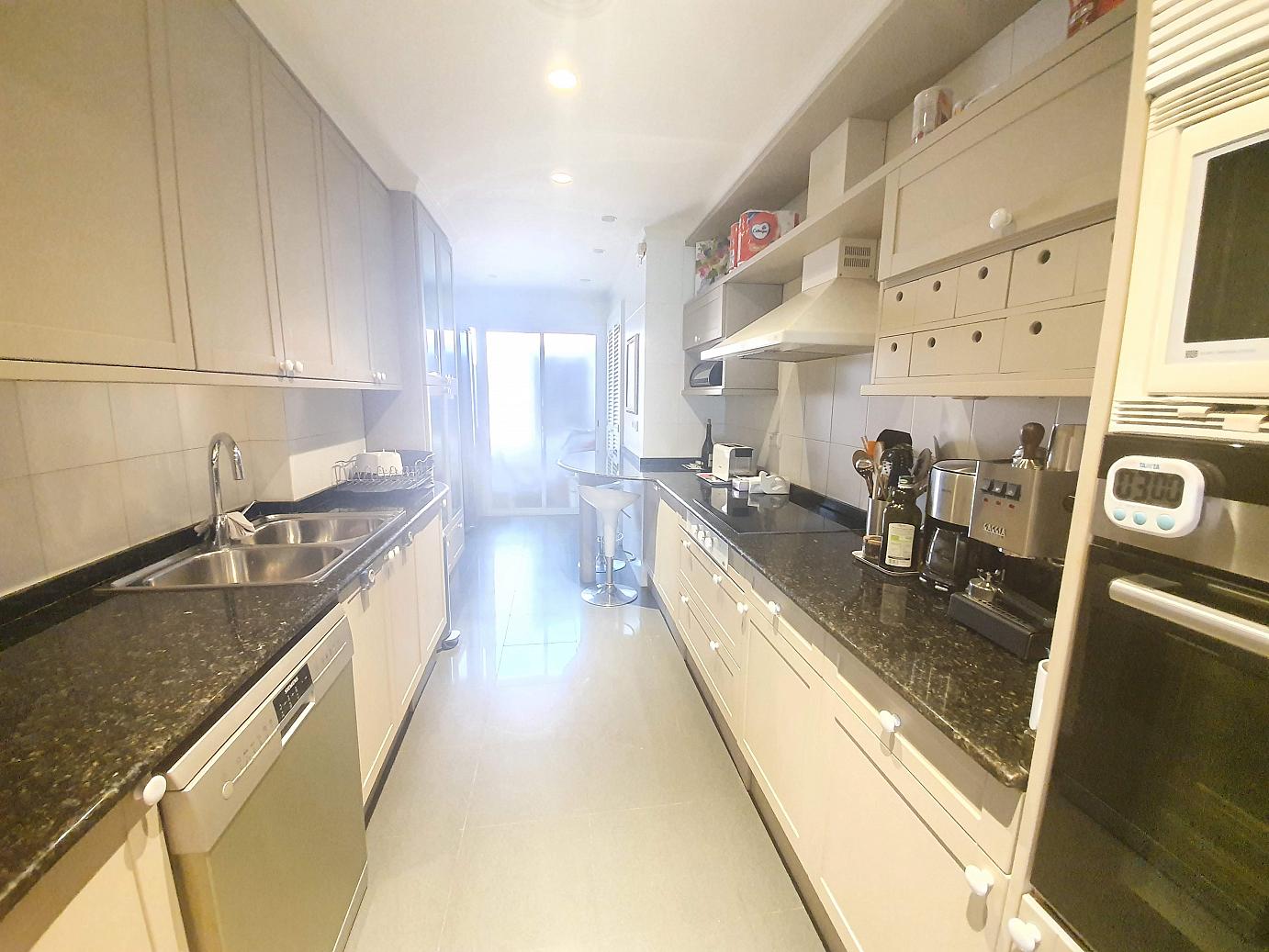 La zona de día consta de un amplio salón comedor a 2 niveles muy soleado, con bonitas vistas a zona verde y orientado a Oeste (Tarragona), cocina office equipada con electrodomésticos, y con cuarto lavadero independiente,